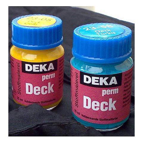 Deka permanent deck is een dekkende textielverf op waterbasis speciaal voor donker gekleurde (spijker)broeken, T-shirts en andere kledingstukken. (werkt natuurlijk ook op gordijnen en andere van textiel gemaakte materialen.
