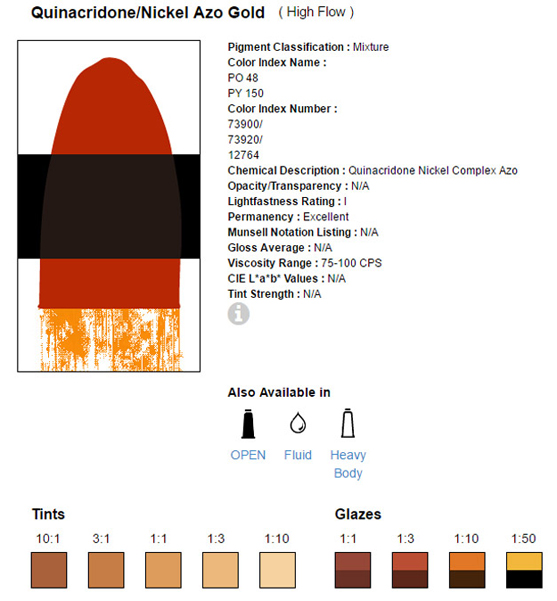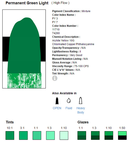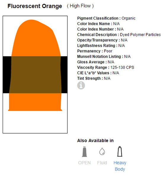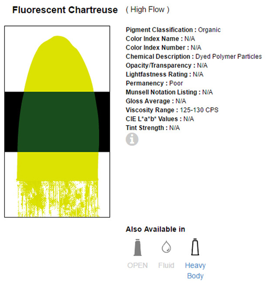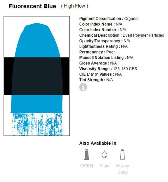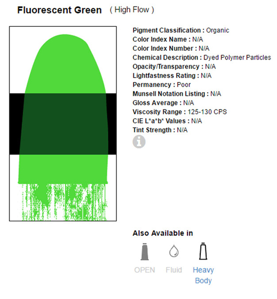 Het zijn vloeiende klueren met een zeer hoge kleurintensiteit, verkrijgbaar in opaque en transparante formules. Voor de flow Acrylics wordt enkel gebruik gemaakt van 100% acrylpolymeeremulsie en licht vaste pigmenten. Na droging watervast.