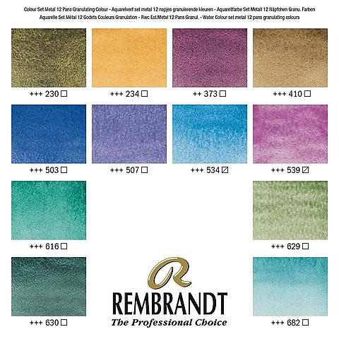Schemering geel (230), Sienna naturel (234), Schemering roze (373), Omber groenachtig (410), Frans ultramarijn (503), Ultramarijn violet (507), Ceruleumblauw (534), Kobaltviolet (539), Vert émeraude (616), Groene aarde (629), Schemer groen (630), Kobalt-turkooisgroen (682) en een reispenseeltje