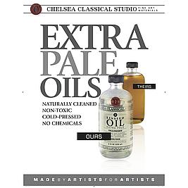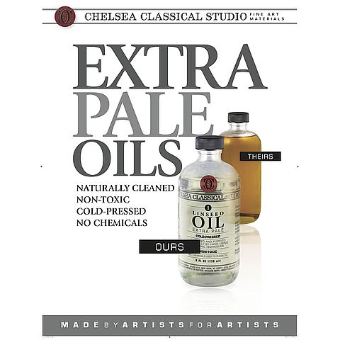 Bij moderne processen wordt gebruik gemaakt van chemicaliën, bleekmiddel en warmte. Chelsea Classical Studio gebruikt koudgeperste oliën, die volgens oude tradities worden gewassen, gezuiverd en ontslijmd. Bovendien drogen de Lijnolie Extra Bleek & Koudgeperst en de Walnootolie Extra Bleek & Koudgeperst sneller dan de meeste andere (ongezuiverde) oliën.