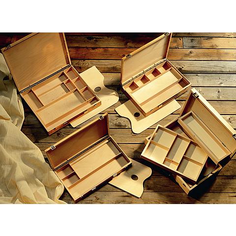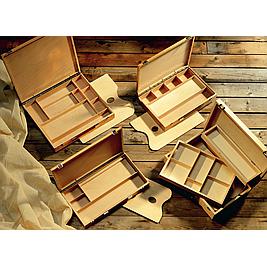 1265199   Lege houten kist vurenhout, met praktische vak indeling en houeten palet. Ideaal om je schilderspullen in op te bergen en of mee te nemen.