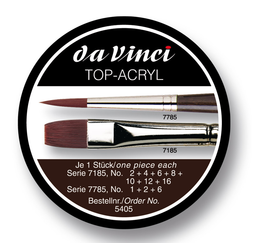 | 6915405 | Blikken koker gevuld met 10 stuks Da vinci Top acryl penselen. Zeer veerkkrachtige syntetische haren geschikt voor acrylverf technieken Series (7185 platgezet) en 7785 (rondgezet). |