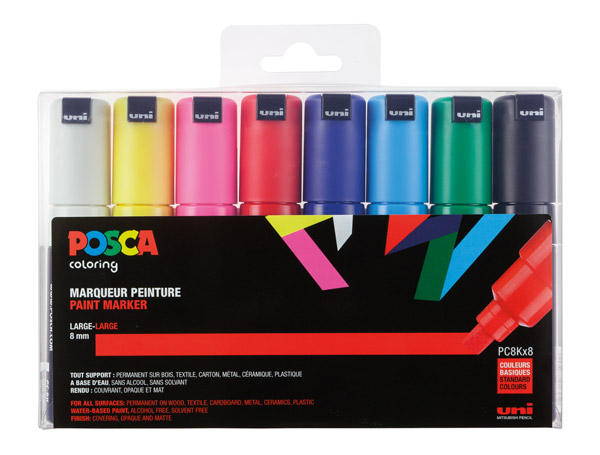 DE Verfmarker op waterbasis. Geschikt voor elke ondergrond. Ontdanks de waterbasis is de Posca marker na droging watervast en zeer lichtecht. De kleuren blijven lang mooi of u deze nu binnen of buiten gebruikt. De verschillende kleuren zijn in 1x dekkend en u kunt er mee mengen, aquarelleren, na droging overschilderbaar, te gebruiken als textiel marker en u kunt ermee patineren. De mogelijkheden zijn eindeloos.