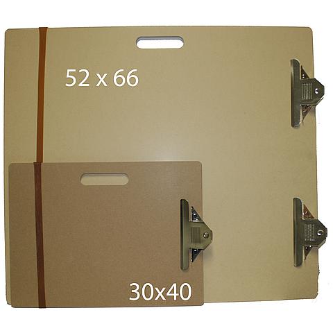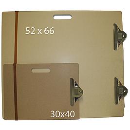 Tekenplank met klem(men) om tekeningen vast te zetten, een rubberband en handvat.