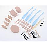 Diverse sponsachtige schildersmessen en diverse sponzen voor het aanbrengen van de panpastels.